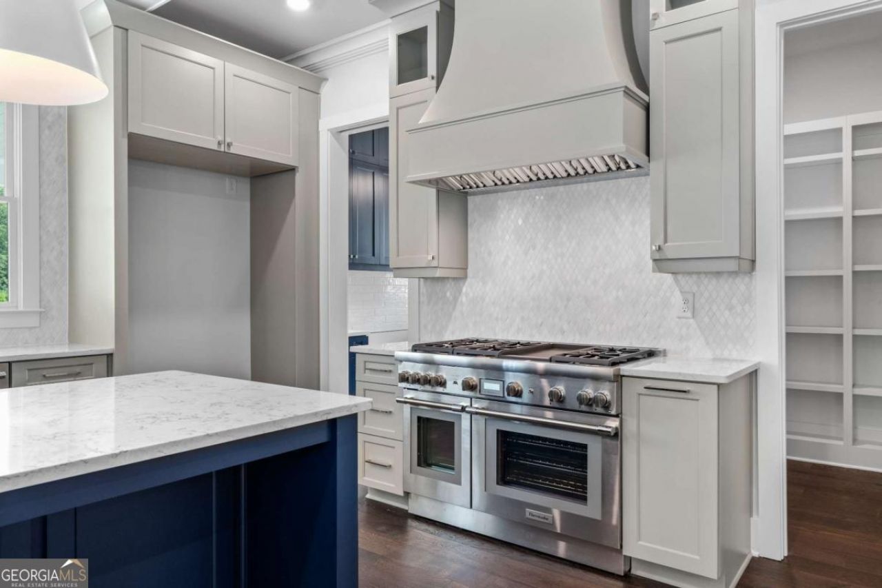 Situated on over an acre of beautifully landscaped grounds in the Estate section of Crossroads, this entertainer focused custom-built home perfectly balances elegance with modern comfort. Featuring a port cochere and detached three-car garage, it combines style, convenience, and functionality. Designed for those who love to host, this home's open flow and thoughtful details make every gathering effortless. Step into the foyer adorned with stained pecky cypress trim and immediately notice the generous office with detailed wall finishes. The oversized family room, anchored by pecky cypress accents and a cast concrete fireplace surround, opens through French doors to an expansive brick patio, seamlessly connecting indoor living to a backyard perfect for a dream pool or outdoor entertainment space. The chef's kitchen is ideal for entertaining, featuring an oversized island with a microwave drawer, dedicated storage for pots and pans, a farmhouse sink, and two dishwashers. The professional-grade 48 Thermador gas range with six high-output burners, griddle, and double ovens serves as the centerpiece, framed by blue and light gray cabinetry reaching 10' ceilings and a custom Subzero refrigerator enclosure. The main-level primary suite provides direct access to the covered porch, a custom-built closet, and a spa-like bath. A guest bedroom on the main floor ensures comfort and privacy for visitors. Upstairs, a spacious bonus room or spacious 5th bedroom, two bedrooms with en-suite baths, and an open loft offer flexible space for family, entertaining, or a home office. Blending sophisticated design with seamless functionality, this home delivers an unmatched Milton lifestyle and a floor plan made for hosting with ease and elegance.