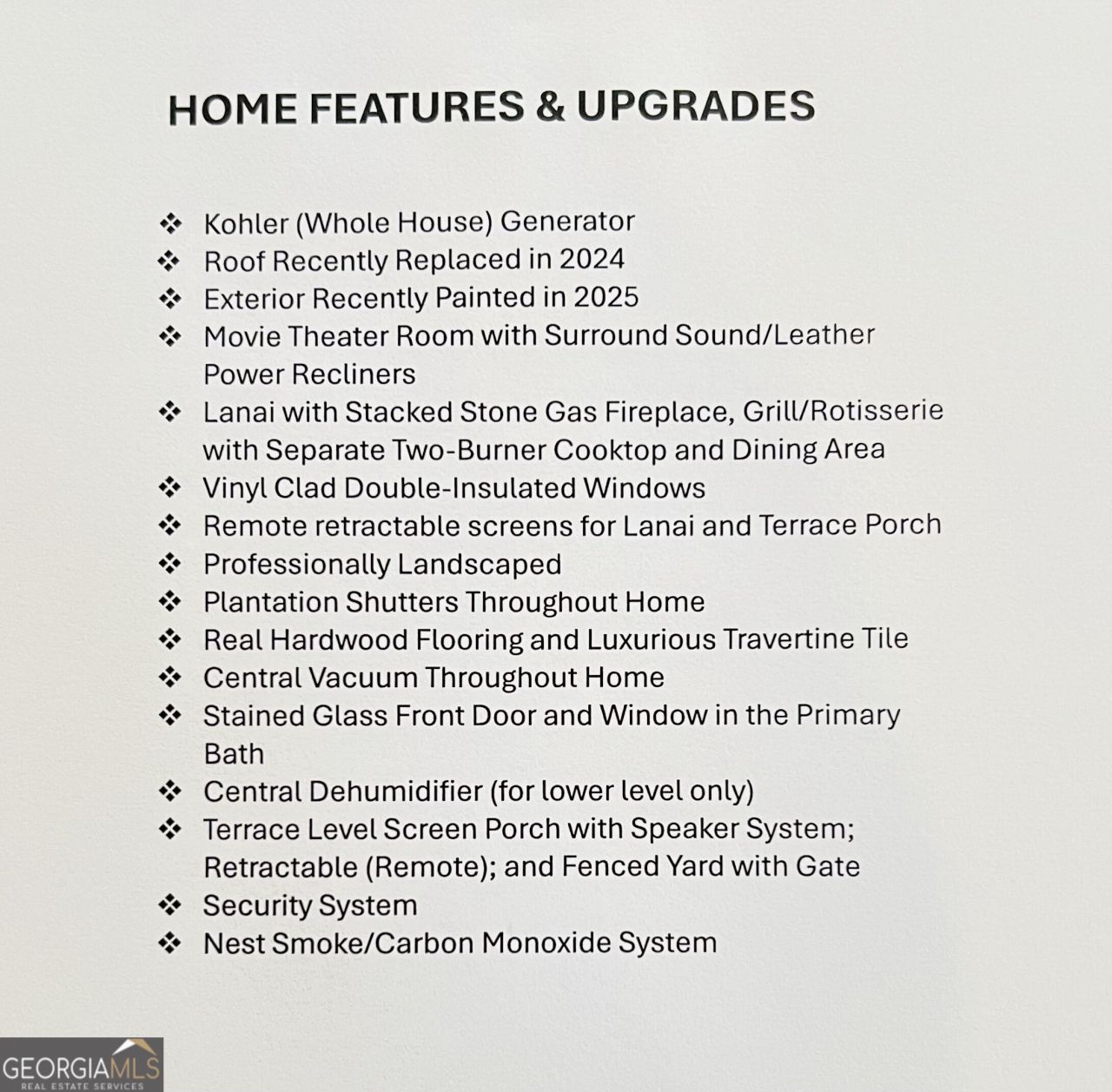 Experience a refined lifestyle in the prestigious 55+ gated community of Johns Creek, designed specifically for active adults seeking comfort and elegance. This exquisite home showcases masterful craftsmanship with many upgrades throughout its open-concept floor plan, creating a seamless blend of timeless design and modern convenience. Step through the stunning stained glass front door into a welcoming foyer adorned with travertine flooring. The private OFFICE/STUDY encompasses plenty of natural light with a view of the front porch. The FAMILY ROOM is highlighted by an inviting gas log fireplace, built-in bookcases, tray ceiling, recessed lights and stunning hardwood floors throughout the common areas. At the heart of the home lies a spacious KITCHEN that is appointed with granite counter-tops, stained cabinetry with an abundance of storage, under-cabinet lighting, stainless steel appliances, gas range, double ovens, and a large island designed for entertaining guests. The DINING area features plenty of space for seating 8 or more guests. The double french doors flow to a private and tranquil wooded view from the LANAI with insulated casement windows with remote retractable screens. This versatile space features a built-in gas grill with hood and side burners for year-round pleasure, dining area, comfortable sitting area, stacked-stone gas log fireplace and surround sound making it perfect for gatherings with friends and family. The main-level PRIMARY SUITE features a vaulted tray ceiling, abundant natural light, and a remote retractable transom shade for sleeping in late, which creates a private sanctuary for relaxation. The spa-inspired ensuite bathroom has elegant travertine tile, a vaulted ceiling, double vanity, large walk-in shower with dual shower heads, a beautiful stained-glass window above the jetted garden tub, and a walk-in dressing room. The SECOND LEVEL offers two well-appointed rooms: An oversized second primary guest suite that allows for privacy and includes plenty of space for a sitting area and office space, and a full bathroom. An additional heated and cooled Flex room can serve as a bunk room, office, exercise area or just used for additional storage. The TERRACE LEVEL features a spacious family living space area with a cozy fireplace, custom shelving, and hardwood floors and storage. This room is impressive with its surround sound for everyday listening and entertaining. The third bedroom suite features a walk-in closet and full bathroom for additional accommodation. As you flow through the family room you will find a dedicated THEATER ROOM, featuring crown molding, a 3D projector designed for an impressive 144 screen, recessed lighting, sconces, custom star ceiling, leather recliners and surround sound. Enjoy the fenced backyard with a wooded view from the private porch with surround sound - complete with remote retractable screens. The lawn maintenance and trash pickup incl in HOA fees. New roof was installed in 2024, and this home has a WHOLE HOUSE GENERATOR. Ample storage can be found in the utility that also encompasses an independent ducted dehumidifier zoned for the terrace level for continual comfort. Beyond the residence, residents enjoy manicured walking trails, community garden, bocce ball, pickleball courts, and the social elegance of a well-appointed clubhouse. The CLUBHOUSE features a billiard room, pool, fitness room, library, meeting rooms, and two kitchens that offer ample opportunities for re