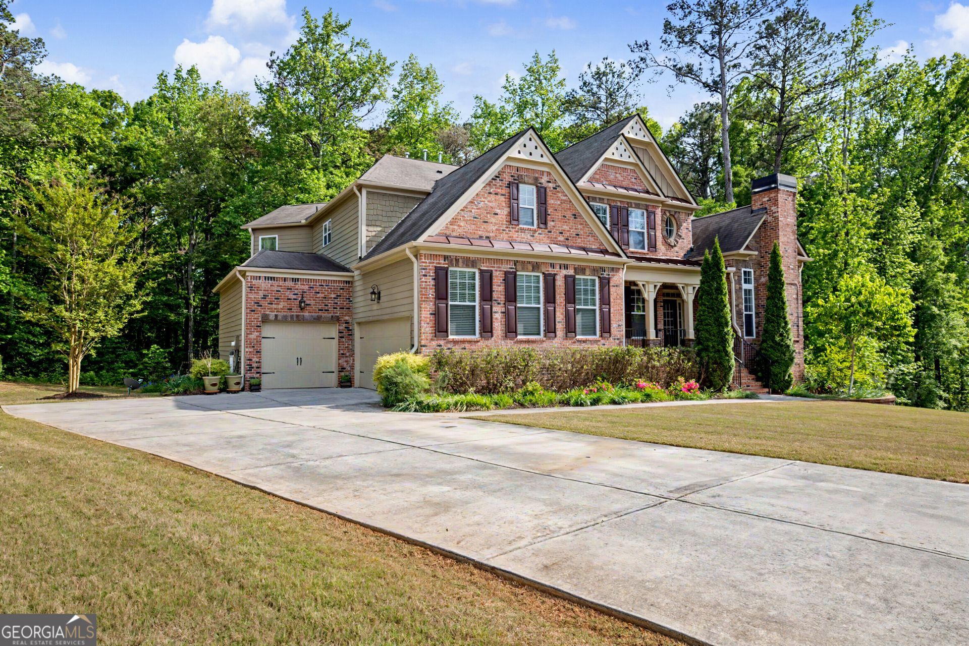 Welcome to this exceptional, meticulously maintained one-owner home offering over 4,300 square feet of beautifully designed living space, plus an additional 2,262 square feet of unfinished potential in the terrace level. From the moment you arrive, the striking brick front, inviting front porch, and professionally landscaped lawn set the tone. Nestled on a private cul-de-sac lot and surrounded by a canopy of mature trees, this home offers both tranquility and curb appeal. Step inside to a grand foyer that opens to thoughtfully designed spaces. A private office with beamed ceilings, hardwood floors, and a floor-to-ceiling stacked stone fireplace creates the perfect work-from-home retreat. The formal dining room impresses with coffered ceilings, detailed molding, and seamless access to the Butler's pantry. The heart of the home is the gourmet kitchen, featuring abundant cabinetry, granite countertops, double ovens, a 5-burner cooktop, tile backsplash, walk-in pantry, and an oversized island ideal for entertaining. The kitchen flows effortlessly into the breakfast area and out to the expansive deck-partially covered for year-round enjoyment and partially open for grilling-all overlooking the peaceful, private backyard. The open-concept layout continues with a stunning keeping room showcasing coffered ceilings and a stone fireplace, along with a spacious family room filled with natural light, hardwood flooring, and elegant finishes. A main-level guest suite with sitting area and full bath provides comfort and privacy for visitors. Upstairs, the oversized primary suite is a true retreat, complete with trey ceilings, abundant space, and a luxurious en-suite bath featuring a dual-head walk-in shower, garden tub, dual granite vanities, and custom walk-in closets. Additional bedrooms are generously sized, including a private en-suite and a thoughtfully designed Jack-and-Jill layout, all with walk-in closets and custom shelving. A large bonus room and well-appointed laundry room add functionality and flexibility. The unfinished terrace level offers incredible opportunity for future expansion, already stubbed for a bathroom and featuring a walk-out patio. Additional highlights include a 3-car side-entry garage, updated lighting throughout, an added electrical panel for future basement buildout, in-ground sump pump with enhanced drainage, and exterior landscape lighting. Located in a sought-after community with sidewalks, streetlights, playground, and a swimming pool, this home truly offers the perfect blend of luxury, comfort, and lifestyle. In addition to these amenities, residents can access parks, recreation spaces, golf courses, nearby shopping, close to Trilith Studios, dining and entertainment. Move-in ready and waiting to welcome you home.