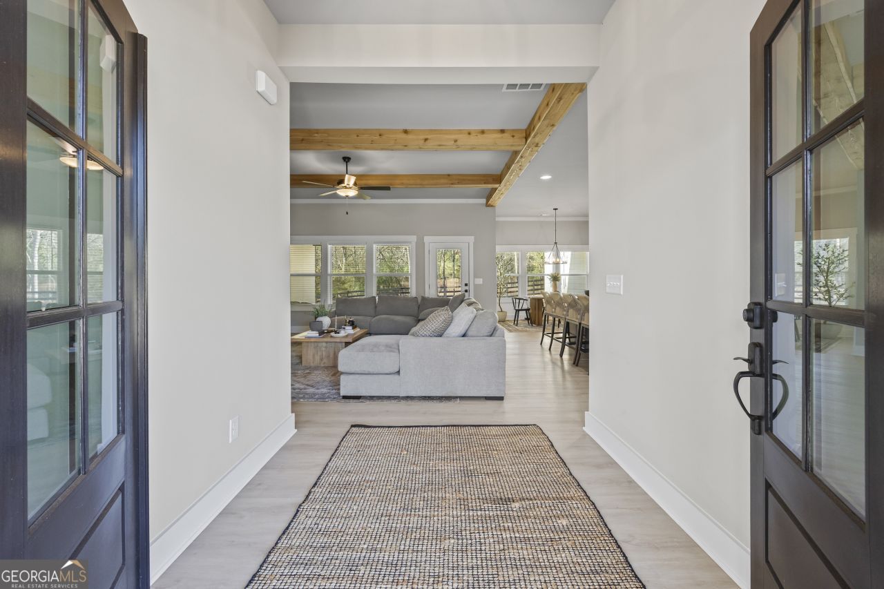 Enjoy effortless single-level living in this stunning 4-bedroom home featuring covered front and back patios plus a dedicated grilling/spa patio. A split-bedroom layout offers privacy for the spacious owner's suite with board-and-batten accents, soaking tub, tiled shower with frameless glass, oversized walk-in closet, and direct access to the laundry and mudroom. The open-concept living area shines with clear polymer coated cedar beams, a 42 gas fireplace, and a bright dining space overlooking the newly fenced in private backyard. The kitchen is a standout with quartz countertops, a large island, tile backsplash, wine rack, spice drawers, and stainless Whirlpool appliances-all with soft-close cabinetry. Thoughtful upgrades include quartz or granite countertops in all baths, tiled shower walls in both bathrooms, matte black fixtures, upgraded trim, and ceiling fans throughout. Additional features include a garage door opener, 4-sided sod, screens installed on all outside of windows. and Rain Bird irrigation system. Conveniently located just 3 miles from Publix and 10 minutes from downtown Monroe-this home blends modern farmhouse style with everyday comfort and convenience.