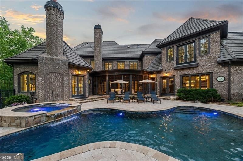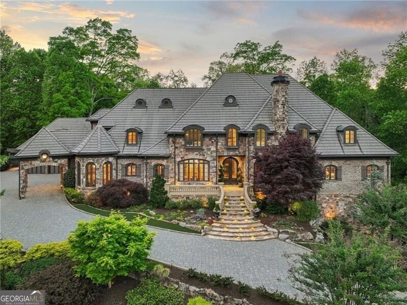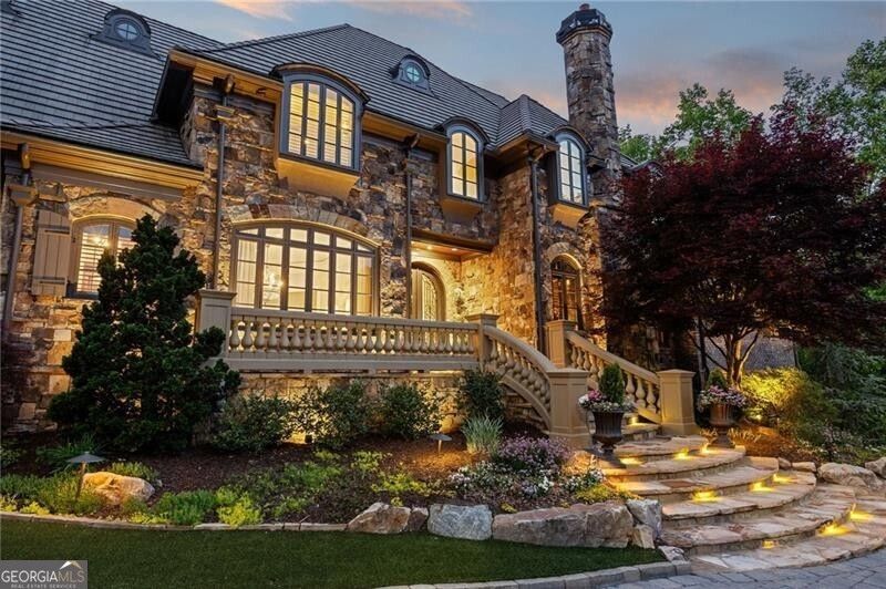 Stunning custom-built French Provincial estate, on just under an acre of land, backs up to 3 unbuildable acres creating an unmatched private setting in East Cobb/ Walton school district. Expertly built by Marshall Veal w/ four sides brick and stone, spray foam insulation, Boral concrete roof, whole-house generator, and exceptional custom trim throughout. Exquisite iron double doors open to a dramatic front-to-back view through the all-season room to the saltwater pool, spa, and outdoor living spaces, new putting green. Designer details include new lighting and window treatments throughout, wire-brushed hardwoods, custom millwork, a handsome study with judge's paneling / built in's, formal dining room, elevator to all 3 levels. Gourmet kitchen features Mouser cabinetry, leathered and polished stone countertops, SubZero refrigerator/freezer and drink drawers, Miele dishwashers, and Wolf appliances, view to fireside family room w/ vaulted ceiling and fireplace. Main-level primary suite includes fireplace and spa bath with huge walk in closet. Upstairs offers a second primary suite, spacious en-suite bedrooms, gym, and kitchenette. Newly renovated terrace level includes all ameneties- second kitchen, rec room, dry sauna, theater room, guest suite, and tons of storage / future expansion space. A rare combination of craftsmanship, privacy, and location-this home is truly a special retreat. Located just minutes to Avenue East Cobb and downtown Roswell.