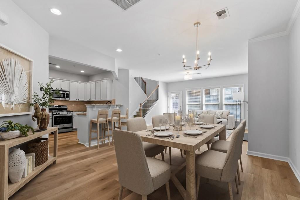 Welcome home to this thoughtfully updated townhome with amazing proximity to I-285, I-75, The Battery, Vinings Jubilee, The Chattahoochee River and more! Fresh paint and warm flooring throughout make this an inviting and move-in ready space. 2 car garage with stepless entry into the kitchen allows for safe storage of vehicles as well as easy grocery hauls - a rarity for townhomes! Soft white cabinetry, beautiful stone countertops, and stainless steel appliances create a kitchen you'll never want to leave. And with open concept into the dining and living area, you never have to! The living room features updated lighting, thoughtful built-ins and a flip switch gas fireplace. Powder room on the main level is easy and convenient making entertaining a breeze. Upstairs is the primary retreat featuring vaulted ceilings and an oversized spa-like bathroom with double vanities, separate tub and shower, an enclosed water closet, and a huge walk-in closet ready to be customized. Enjoy a secondary living or working space in the versatile loft space! Two more bedrooms share a full bathroom along with a large walk-in laundry room on the same level as the bedrooms. Enjoy a nice outdoor patio as well in the secluded green space behind this lovely home. Vintage Square is an amazing community with a strong HOA that covers sewer, water, exterior maintenance, termite control, and more. All conveniently located in the heart of Smyrna!