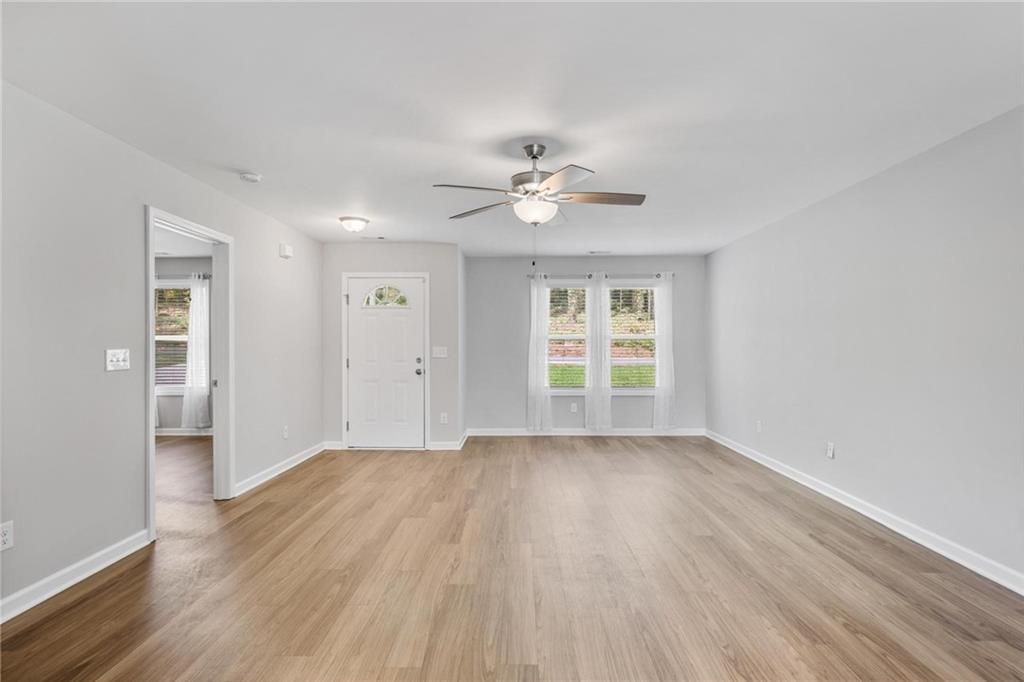 Nearly new and low-maintenance, this beautifully rebuilt ranch home is located just over a mile from Marietta Square, with convenient access to I-75. Completely reconstructed in 2021 after the original structure was lost to a fallen tree, this home offers modern comfort and peace of mind. Step inside to a spacious open-concept living area that seamlessly flows into a dining space, perfect for everyday living and entertaining. The dining area opens to a deck overlooking a large, level backyard?ideal for outdoor gatherings or quiet relaxation. The kitchen is thoughtfully designed with white cabinetry, granite countertops, stainless steel appliances, a breakfast bar, and a generous walk-in pantry. A full laundry room is conveniently located just off the kitchen, near the back door leading to the driveway. The primary suite is privately situated on one side of the home and features a walk-in closet and en suite bath. Two additional bedrooms are located on the opposite side, sharing a full bathroom. The fully fenced backyard is expansive, level, and cleared, offering endless possibilities. At the end of the driveway, a large shed with a concrete floor provides ample storage or workspace?spacious enough to accommodate a vehicle.Don't miss this opportunity to own a like-new home in an up-and-coming neighborhood, just minutes from all the dining, shopping, and entertainment of Marietta Square.