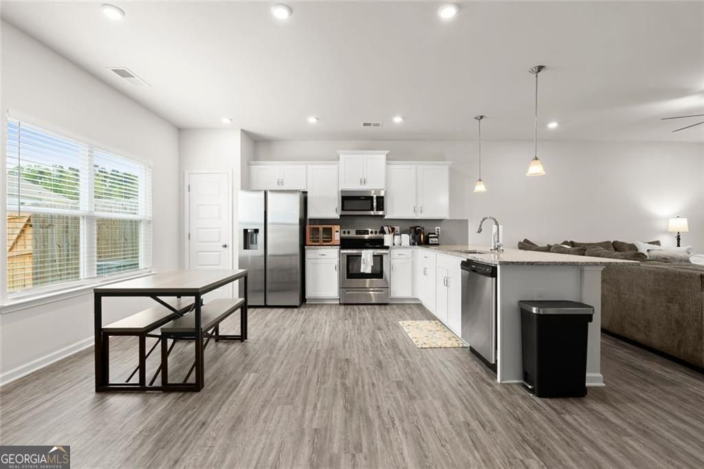 Looking for your first home? 254 Pinnacle Way offers modern finishes, smart design, and low-maintenance living in Jasper. The main level features LVP flooring throughout, an open layout, and a rear kitchen with granite countertops, stainless steel appliances, and direct access to the patio. The upstairs owner's suite provides a private retreat, with two additional bedrooms and an upstairs laundry room for convenience. Nine-foot ceilings on both levels keep the home light and welcoming. HOA-maintained lawn care and quick access to shopping, dining, and Highway 575 make this an ideal first home.