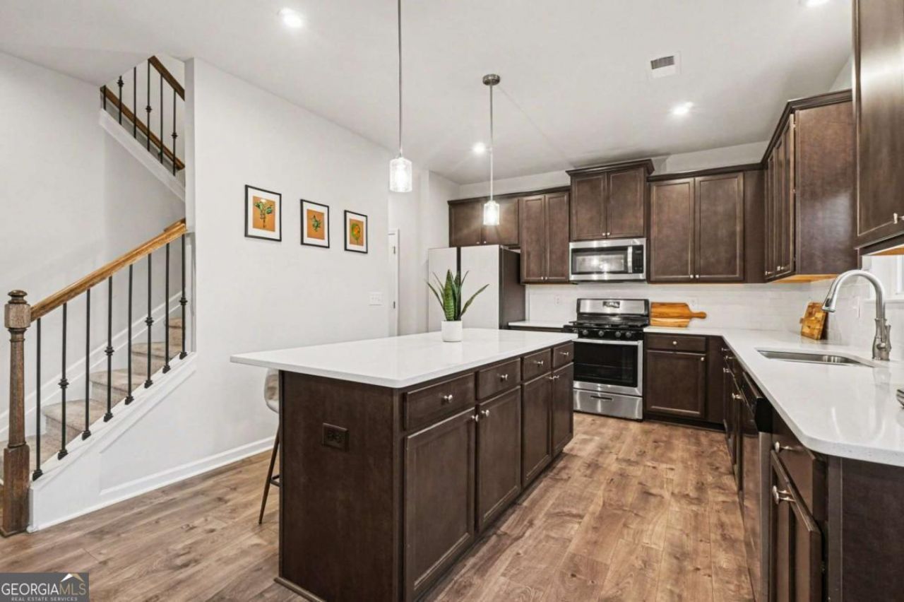 Beautifully maintained, this 4-bedroom, 2.5-bath home offers 2,383 square feet of modern comfort in the highly sought-after McEachern High School district. As you enter, you're immediately greeted by a striking designer flex space with bold accent walls, currently styled as a modern entertaining area. It creates a memorable first impression and can easily transition into a traditional dining room if desired. The open-concept main level is designed for connection. The kitchen features quartz countertops, rich cabinetry, stainless steel appliances, a spacious island perfect for gathering, and an oversized pantry that keeps everything organized and within reach. It flows seamlessly into the living area, creating a space that feels both functional and inviting. Upstairs, the spacious primary suite offers a tray ceiling and a spa-like bath complete with double vanities, a soaking tub, and a separate shower, the perfect place to unwind at the end of the day. The secondary bathroom also features double sinks, and all bedrooms include walk-in closets, providing generous storage throughout. Step outside into the large, fully fenced backyard featuring two pergolas and an extended patio that create inviting outdoor living spaces perfect for entertaining, play, or simply enjoying added privacy. Fresh, modern, and move-in ready, this home offers more than just square footage - it offers space to grow into what's next.