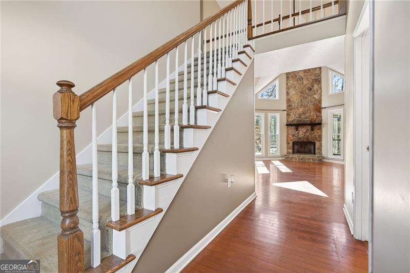 This charming two-story traditional home offers exceptional curb appeal with an inviting stone front and a desirable level lot. Classic architectural details and a welcoming presence make this home stand out from the moment you arrive. The primary bedroom is conveniently located on the main level, providing comfort and privacy. A chef-style kitchen with abundant cabinet space opens seamlessly to the two-story great room with an impressive floor to ceiling stone fireplace, creating the perfect setting for everyday living and entertaining. Hardwood floors span the entire main level, complemented by a formal dining room ideal for hosting gatherings. This home is filled with natural light, thanks to an abundance of windows that create a bright, airy atmosphere throughout. Sunlight pours into the living spaces, highlighting the open layout and enhancing the warmth and beauty of the home from morning to evening Step outside to enjoy a private screened porch overlooking the backyard-perfect for relaxing mornings or evenings. Upstairs, you'll find two additional bedrooms, a full bathroom, and a spacious bonus room located off one of the bedrooms, offering flexible space for a playroom, home office, or media room. Recent updates include brand-new windows throughout, along with a new driveway and sidewalk. Located in a family-friendly community with exceptional amenities, this home combines classic charm, modern updates, and a welcoming neighborhood atmosphere.