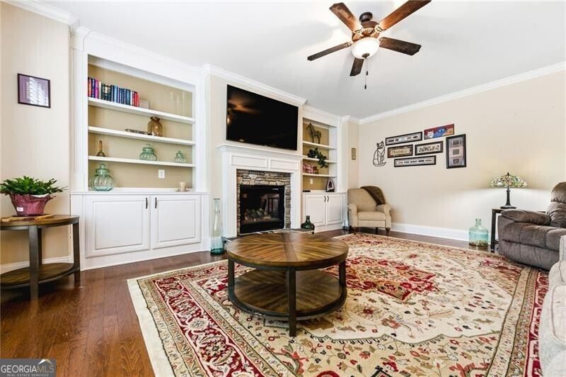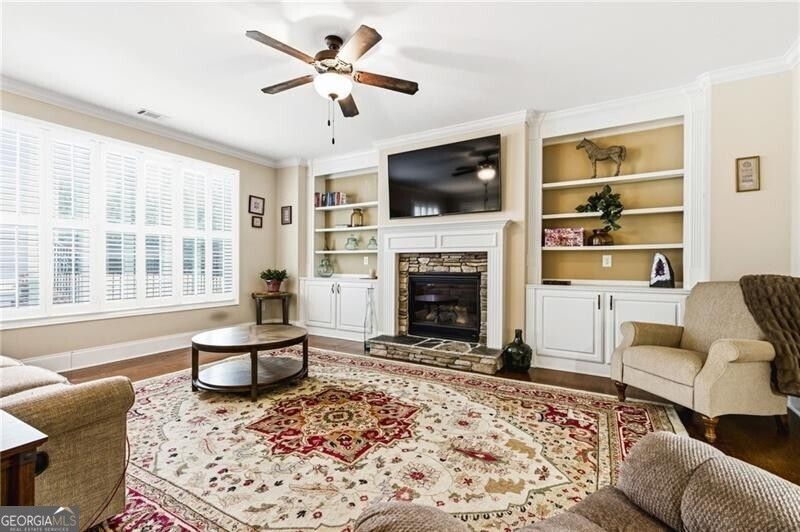 Fantastic 55+ home in the sought-after Windsong community of Encore! An inviting front porch welcomes you into a spacious foyer that sets the tone for this wonderful home. The well-appointed kitchen features granite countertops, stained cabinetry, stainless steel appliances including a built-in microwave and pendant lighting over the island-perfect for entertaining. The laundry is just off the kitchen on the main floor. The extremely open floor plan flows seamlessly into the family room, complete with built-ins flanking a cozy gas log fireplace and an open dining area ideal for gatherings. The spacious primary suite on the main level boasts a charming bay window and a thoughtfully designed bath with an oversized shower with seat and an oversized walk-in closet. A secondary bedroom on the main also offers a walk-in closet and a full bath with seamless shower doors- perfect for guests. A large sunroom/porch area extends your living space and opens to a delightful side courtyard featuring low-maintenance faux grass and a brick paver pathway- an ideal spot to relax and unwind. Wonderful, private green space awaits you just beyond the fence in the back of your courtyard adding privacy. Upstairs, you will find an additional bedroom with walk-in closet and a full private bath, providing flexible space for visitors or hobbies. Don't miss the wonderful, walk-in attic space upstairs that is ideal for extra storage. Windsong residents enjoy access to a wonderful clubhouse complete with a workout facility, making it easy to stay active and connected in this vibrant 55+ community. Also in the common space across from this home are walking trails to enjoy.