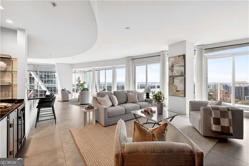 A rare offering in highly sought-after Terminus - one of only three residences with this sexy and coveted floor plan - this impressive corner unit embodies elevated Buckhead living with its expansive layout and nearly 360-degree skyline views from the 3 separate terraces. An entertainer's dream, the open-concept living area features a fireside great room and a sleek bar complete with Sub-Zero wine storage. The adjoining dining and media rooms flow seamlessly into a gourmet kitchen outfitted with top-of-the-line appliances, including Sub-Zero refrigeration, Wolf gas range and warming drawer, and a convenient breakfast bar. A separate catering entrance off the kitchen makes hosting effortless. Step outside to the oversized, covered terrace and take in breathtaking views of both Buckhead and Downtown - the perfect backdrop for dining or entertaining al fresco. Privately situated, the luxurious primary suite with Venetian plaster walls offers a tranquil retreat with a sitting area framed by floor-to-ceiling corner windows, a private covered terrace with views of Stone Mountain and Buckhead, and an expansive custom walk-in closet with a built-in safe. The spa-inspired bath showcases dual vanities and water closets, a soaking tub, and a frameless glass shower - all positioned to capture the home's extraordinary vistas. Two additional guest suites, each with ensuite baths, share a third balcony and are thoughtfully placed off the foyer for privacy. Additional highlights include Famosa Italian tile throughout, motorized shades throughout, leak defense water system, Toto toilets, and a fully integrated Lutron and Control4 smart home system and a 1/2 bathroom. Two deeded, covered parking spaces complete this exceptional offering. Perfectly positioned at Terminus, just steps from Buckhead's finest dining, shopping, and MARTA access.