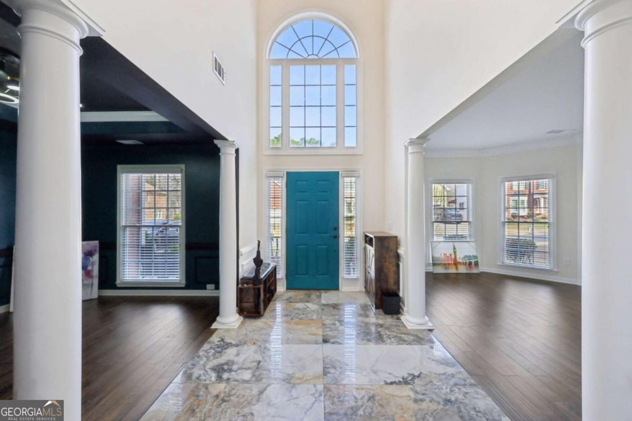 Stately two-story home with a classic brick front and timeless curb appeal! Step inside to a dramatic two-story foyer featuring elegant marble floors and architectural columns that set the tone for the home's refined style. To the left, a versatile flex room offers the perfect space for a home office or formal sitting room. To the right, the formal dining room makes a statement with arched niches and a modern light fixture, creating an inviting setting for memorable gatherings. The bright open concept living room showcases rich wood floors, a cozy fireplace, and soaring two-story ceilings, all complemented by tons of natural light. The spacious kitchen is designed for both function and style, featuring an oversized island, tile backsplash, stainless steel appliances, breakfast bar seating, and a generous breakfast room. Double doors open to the back patio, seamlessly blending indoor and outdoor living for effortless al fresco dining. A convenient half bath completes the main level. Upstairs, retreat to the oversized primary suite, highlighted by a tray ceiling and plenty of space for a cozy reading nook. The en-suite bath includes dual sinks, a vanity seating area, separate soaking tub, and a glass-enclosed shower, along with a large walk-in closet. Three spacious secondary bedrooms, each with ample closet space, share a full bath, offering comfort and room for everyone. Convenient upstairs laundry room. Out back, the private yard backs to tranquil woods, creating a peaceful natural backdrop. A pergola-covered patio provides the perfect space for outdoor entertaining, relaxing, or simply enjoying the serenity of your surroundings. Book your tour today! Seller is offering $5,000 toward closing costs!