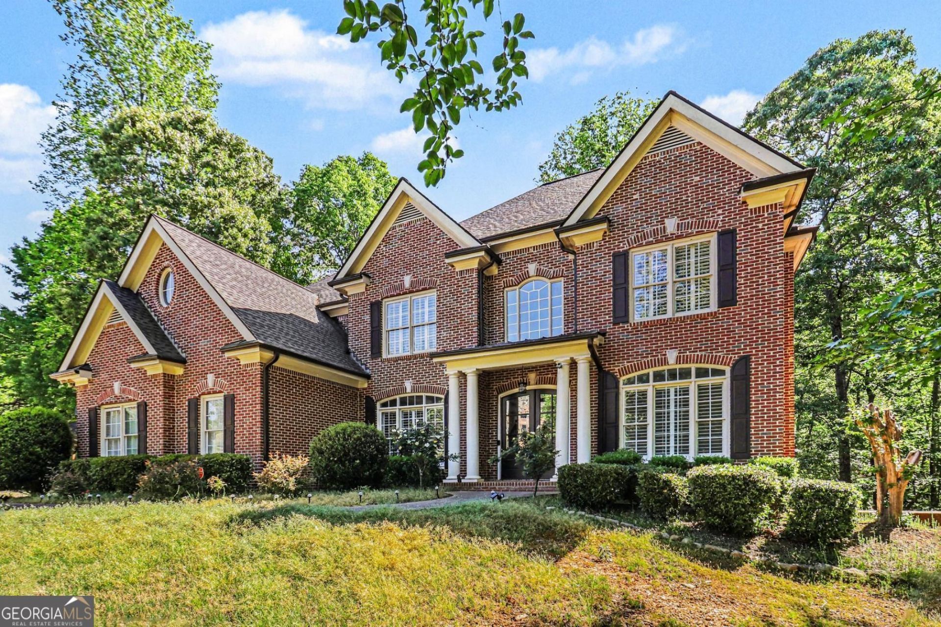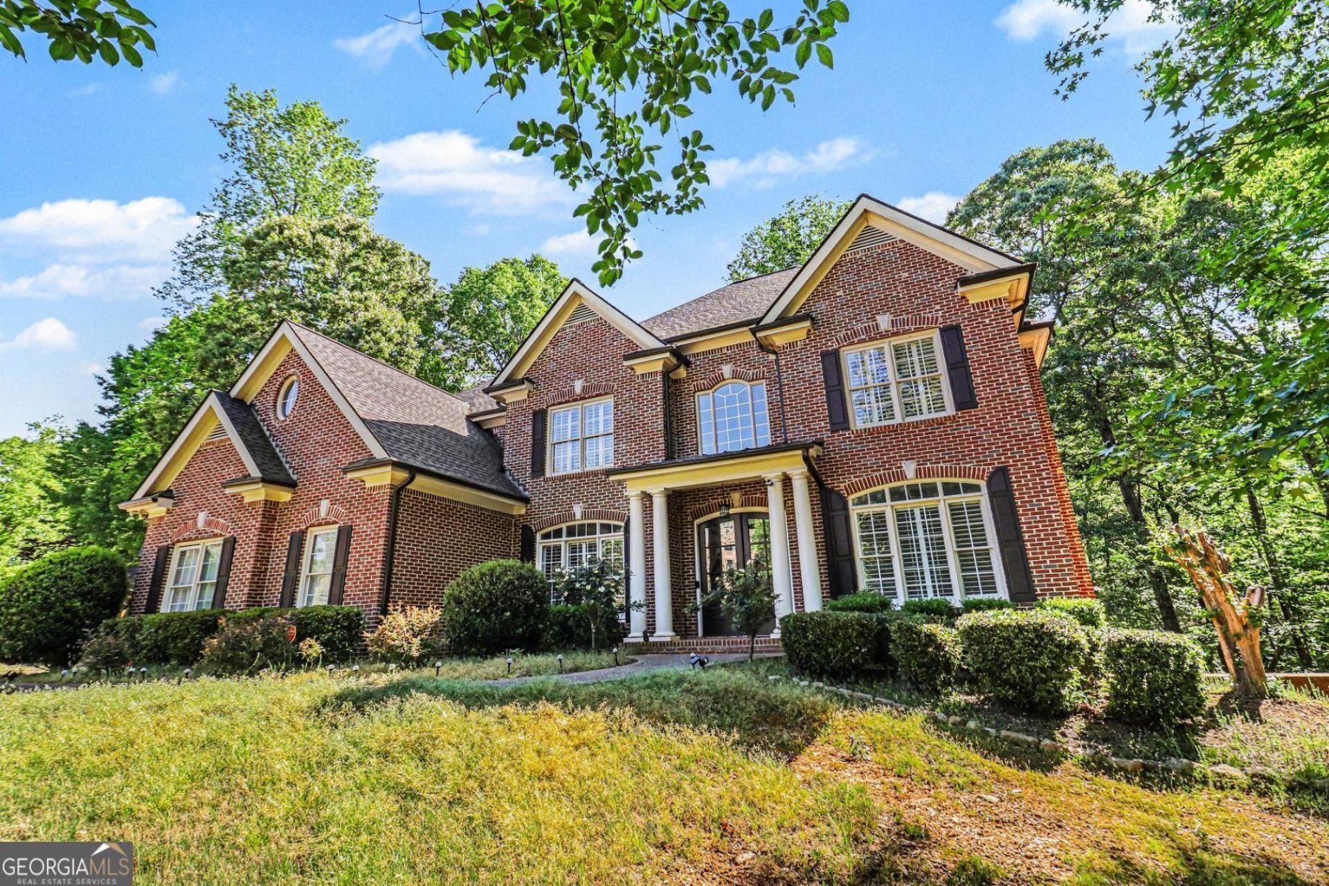This stunning full brick estate sits on over 1.5 acres of beautifully landscaped grounds with a serene wooded backdrop, offering privacy, space, and timeless elegance. A dramatic two-story foyer welcomes you inside, where rich hardwood floors flow throughout the main level. Just off the entry is a private home office, perfect for today's work-from-home lifestyle. The fully remodeled chef's kitchen is the heart of the home, featuring a large center island, walk-in pantry, marble countertops, double electric wall ovens, gas cooktop and range, and high-end finishes throughout. The kitchen opens seamlessly to the soaring two-story great room anchored by a striking stacked-stone fireplace-ideal for both everyday living and entertaining. A formal dining room with detailed trim adds classic sophistication. The luxurious primary suite offers a peaceful retreat with a trey ceiling, plantation shutters, and a spa-inspired bath complete with a soaking tub, separate shower, tile floors, and walk-in closet. Downstairs, the fully finished basement transforms the home into a true entertainer's dream, featuring an additional bedroom and full bath, an exercise room, and two expansive flex spaces perfect for a media room, game room, or additional family living areas. With over of thoughtfully designed living space, this home offers 6 bedrooms and 5 full bathrooms. Outdoor living is just as impressive, with a large back deck overlooking tranquil wooded views and an expansive stone patio complete with a stone fireplace and ambient outdoor lighting-perfect for hosting or unwinding under the stars. A three-car side-entry garage completes this exceptional property.