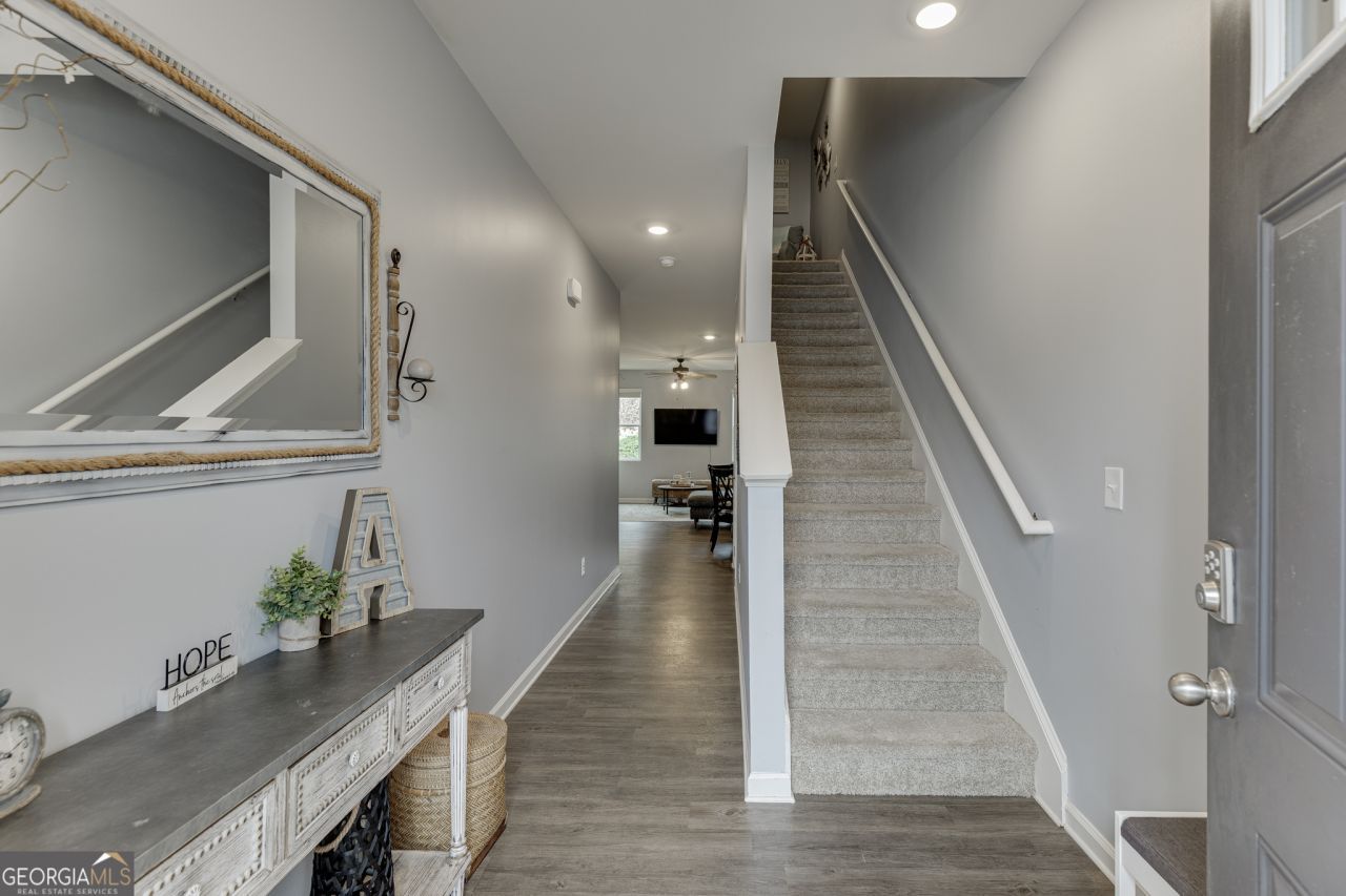Welcome to this beautifully maintained END-UNIT townhome with a fenced backyard! This 3-bedroom, 2.5-bath home in the desirable Prescott community offers a bright open layout perfect for modern living. The main level features durable LVT flooring, a spacious living area, and a stylish kitchen with granite countertops, stainless steel appliances, large island, and pantry. Upstairs you'll find a generous primary suite with walk-in closet, double vanities, and a large shower, plus two additional bedrooms and convenient upstairs laundry. Step outside to enjoy the private, fully fenced backyard and covered patio ideal for relaxing, pets, or entertaining. Located in a swim and playground community just minutes from schools, shopping, major highways, and Lake Lanier. Move-in ready and a rare end-unit opportunity you don't want to miss!