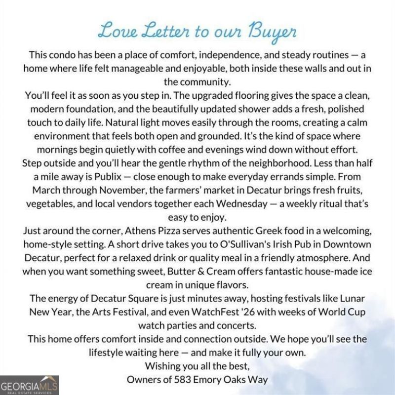 The following perspective is shared directly from the Owners of 583 Emory Oaks Way: This condo has been a place of comfort, independence, and steady routines - a home where daily life felt manageable and connected. With true ground-level entry and no stairs, coming and going has always been simple. Upgraded LVP flooring (2026) creates a clean, modern foundation, and the refreshed 2025 shower adds a polished touch to everyday living. Natural light fills the space, and the private rear patio - accessible from both the living room and bedroom - offers a quiet extension for morning coffee or relaxed evenings. Living here meant walking to Publix, visiting the Decatur Farmers Market, and being just minutes from Emory University Hospital and Downtown Decatur, where festivals, seasonal markets, and community events bring energy while still returning home to a peaceful residential setting. FROM THE LISTING AGENT: We intentionally priced below recent comparable sales in the Decatur/Emory corridor of Intown Atlanta, this one-bedroom ground-level residence combines accessibility, location strength, and ownership simplicity. Emory Oaks is a 40-unit established community with mature landscaping, assigned parking (Space 15), dedicated basement storage, and a structured HOA covering water, sewer, trash, exterior maintenance, exterior insurance, and roof maintenance - converting irregular exterior expenses into predictable monthly budgeting. The $450/month HOA fee reflects comprehensive exterior coverage. HVAC was replaced in 2020, and sellers report no insurance claims during ownership. Located approximately two miles from Emory and Downtown Decatur and about four miles from I-85, proximity within this institutional corridor consistently supports housing demand. Rentable per community guidelines, the property offers flexibility for both owner-occupants and long-term investors. A structured Life at 583 Emory Oaks Way OVERVIEW IS AVAILABLE detailing updates, HOA coverage, rental guidelines, and pricing positioning relative to recent comparable sales.