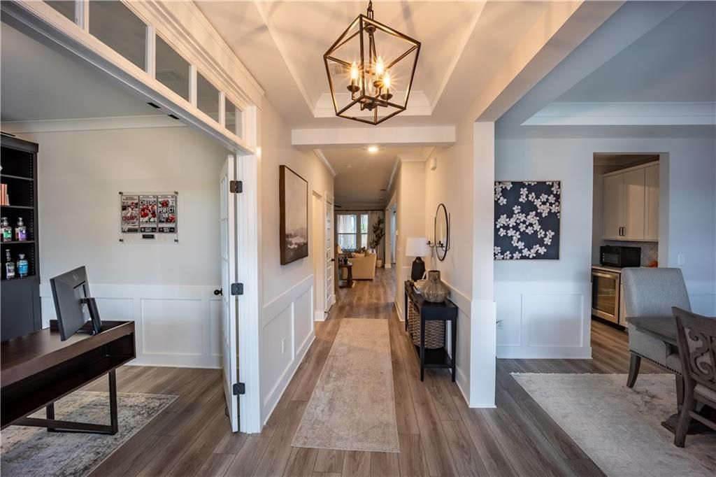 Come on in and prepare to be impressed! This one-owner home is truly better than brand new, showcasing every upgrade you could want and designed with entertaining in mind. The spacious two-story floor plan offers five bedrooms and three-and-a-half baths, blending luxury and functionality throughout. The main level features a formal dining room and a private office with custom built-ins and elegant French glass doors. The heart of the home is the stunning kitchen, complete with a large island, breakfast area, walk-in pantry with built-ins, and seamless flow into the oversized family room highlighted by a custom accent wall. The fifth bedroom has been converted into a media room but can easily be reimagined to suit your needs, endless possibilities await. Enjoy the screened-in back patio, plus a cozy fire pit for gatherings with friends and family. Upstairs, all bedrooms are thoughtfully positioned. The luxurious primary suite is a true retreat, featuring walk-in closet, spa-like shower, soaking tub, and separate vanities. Community amenities include a pool, playground, and dog park. Conveniently located near shopping, dining, and I-85