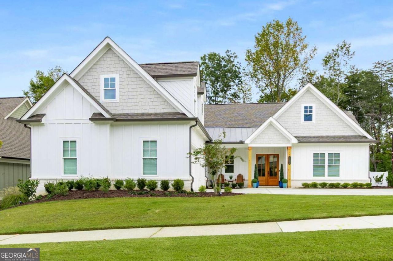 Vacation at home! INCLUDES BOAT SLIP AND LIFT (Valued at $105,000) This custom built modern farmhouse located in coveted Marina Bay is a breath of fresh air. Hard to find floorplan features three bedrooms (including primary) + office on main level! Thoughtfully designed for today's lifestyle, step inside your solid oak and glass double front doors and you are greeted by an impressive entry with 10' ceilings, cased openings, gleaming wide plank white oak floors, six panel doors and designer lighting. The kitchen has a natural flow between the fireside den and dining room. You are drawn in to the tremendous casement window overlooking your peaceful wooded backyard view - everything about this home is pure peace. This stunning custom kitchen features professional grade Bosch appliance package, 4' x 8' custom leathered stone kitchen island, custom pull out shelves on lower cabinets, solid wood cabinets with soft close, a heavy duty built-in Mixer Lift inside the kitchen island cabinet, Sharp microwave drawer, large walk-in pantry and custom site built floating wood shelves! Open to the den with brick fireplace and wood mantle that thoughtfully matches the floating kitchen shelves + designer fan and wall of windows! Main level primary retreat with spa bath featuring huge multi-headed shower, frameless glass shower door, large bench and custom tile work! Huge vanity with double sinks, loads of storage and built-in makeup vanity! The walk-in closet is more of a dressing room. Custom shelving throughout and a sitting room - this home does not disappoint! Your guests will not want to leave! The secondary bedrooms rival chic hotels and are thoughtfully located on the opposite side of the home away from the primary suite. Upstairs is another private suite with full bath currently used as a home gym. You will also find yourself drawn outside to the incredible screened-in porch with second fireplace and mounted TV - perfect place to gather for game night! Host family and friends for a BBQ on the uncovered deck too! Only a couple of steps down to your fully fenced in backyard featuring lush landscaping and a flat green space for your pups! The extra large 2.5 car garage can accommodate large vehicles plus golf cart without issue! Meticulously maintained inside and out, this home also has an irrigation system to ensure beautiful grounds year round! Marina Bay has top tier amenities - tennis, pickleball, pool, clubhouse, gym, neighborhood parks/playgrounds - this is the Lake Lanier lifestyle you are looking for without the maintenance or hassle! Relax - you're at Marina Bay. Welcome Home!