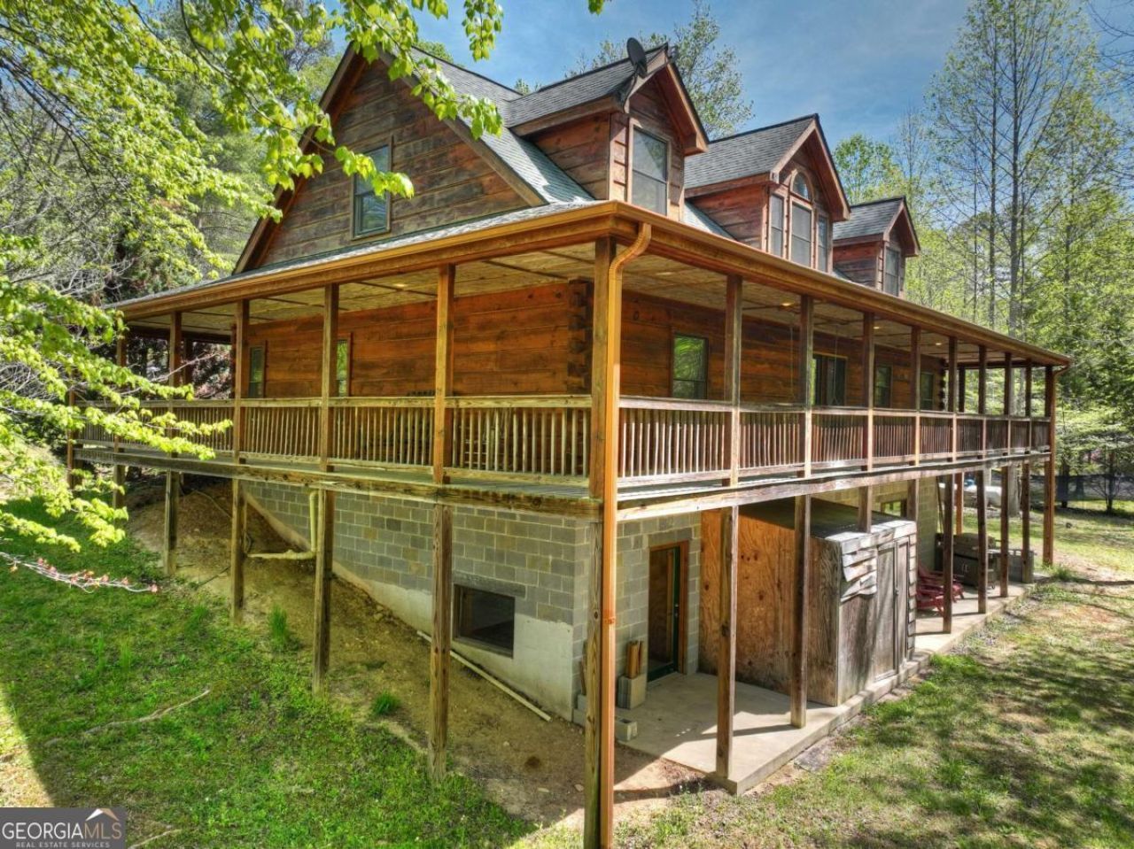 Tucked along the gentle banks of Little Sugar Creek, 76 E Bevan Lane is a custom-crafted rustic lodge offering the perfect blend of refined mountain luxury and total seclusion. Overlooking the soothing, rippling waters, this six-bedroom retreat with additional loft and four full baths is designed for both elevated living and unforgettable entertaining. A grand great room welcomes you with soaring ceilings, exposed wood elements, and a commanding stone wood-burning fireplace, creating a warm and inviting focal point. The gourmet kitchen flows seamlessly into a spacious dining area, ideal for hosting gatherings of any scale. The terrace level is built for leisure, featuring a full den and game room, while two laundry rooms provide convenience for larger groups or full-time living. Outdoors, expansive covered wraparound decks invite you to relax, dine, and take in the peaceful sounds of the creek below. With exceptional privacy, stunning frontage on Little Sugar Creek, and just minutes to Downtown Blue Ridge, this fully furnished property presents an extraordinary opportunity as a luxury retreat, full-time residence, or high-performing investment.