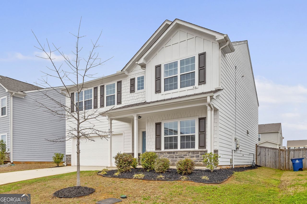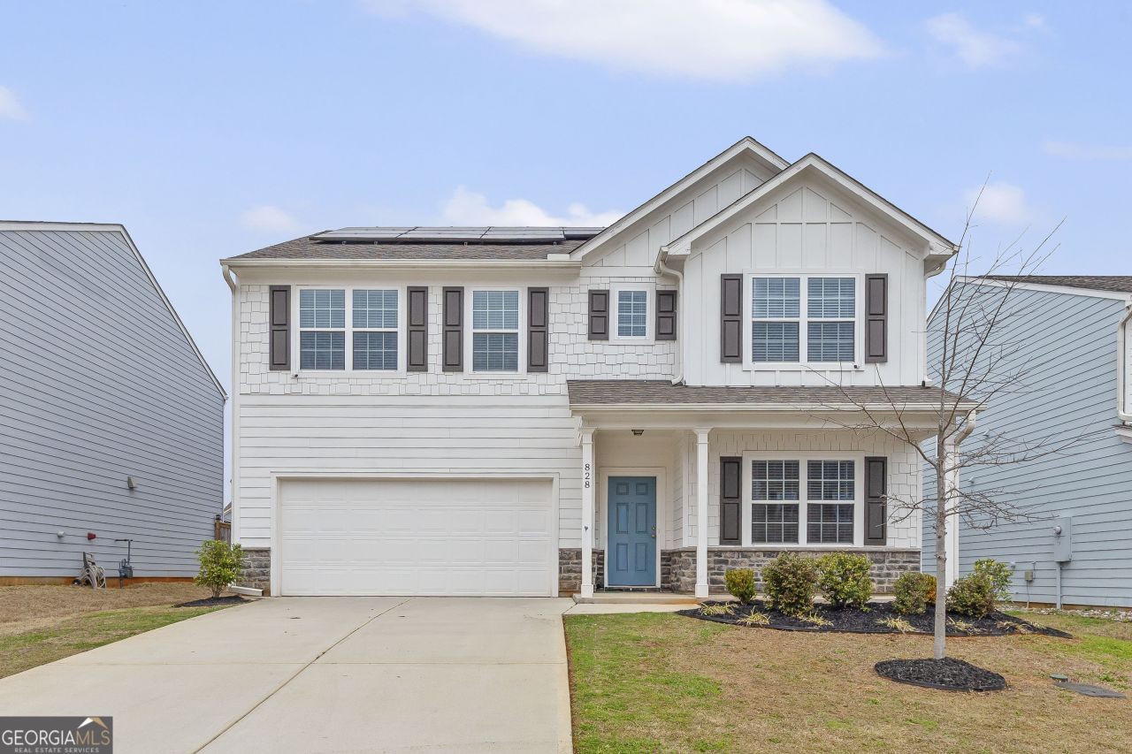 Spacious, energy-efficient living in a welcoming community-this beautifully designed home offers room to grow, gather, and enjoy. This 4-bedroom, 2.5-bath home built in 2022 offering 2,682 square feet combines modern comfort, energy efficiency, and a layout made for everyday living. Located in a friendly neighborhood with sidewalks and a community pool, the home also offers convenient access to premier shopping, dining, and everyday essentials. From the moment you arrive, the home's inviting curb appeal stands out, highlighted by installed solar panels that help reduce energy costs and provide long-term efficiency. Inside, the open-concept main level creates a natural flow between living spaces. The kitchen is the centerpiece of the home, featuring granite countertops, stainless steel appliances, abundant white cabinetry, and a large island perfect for casual meals, entertaining, or gathering with family and friends. It opens seamlessly to the spacious living and dining areas, where a cozy fireplace creates a warm and welcoming focal point. Upstairs, the primary suite offers a relaxing retreat, complete with tray ceilings, generous space and an ensuite bath. The ensuite bath features a double vanity, soaking tub and separate tile shower. Three additional bedrooms provide flexibility for family, guests, or a home office, while the large bonus room offers endless possibilities as a media room, playroom, or additional living area. Step outside to a large fenced backyard with a wooden privacy fence, ideal for pets, outdoor entertaining, or simply enjoying your own private outdoor space. With energy-efficient solar panels, generous living space, versatile rooms, and a location close to shopping, dining, and community amenities, this home offers the perfect combination of comfort, convenience, and value. Move-in ready and designed for modern living-this is one you won't want to miss.