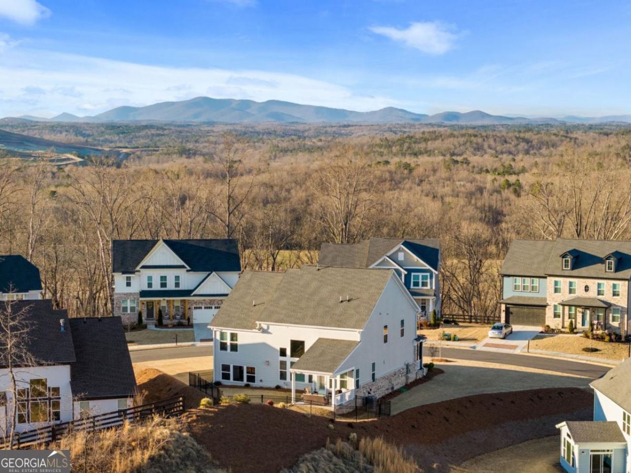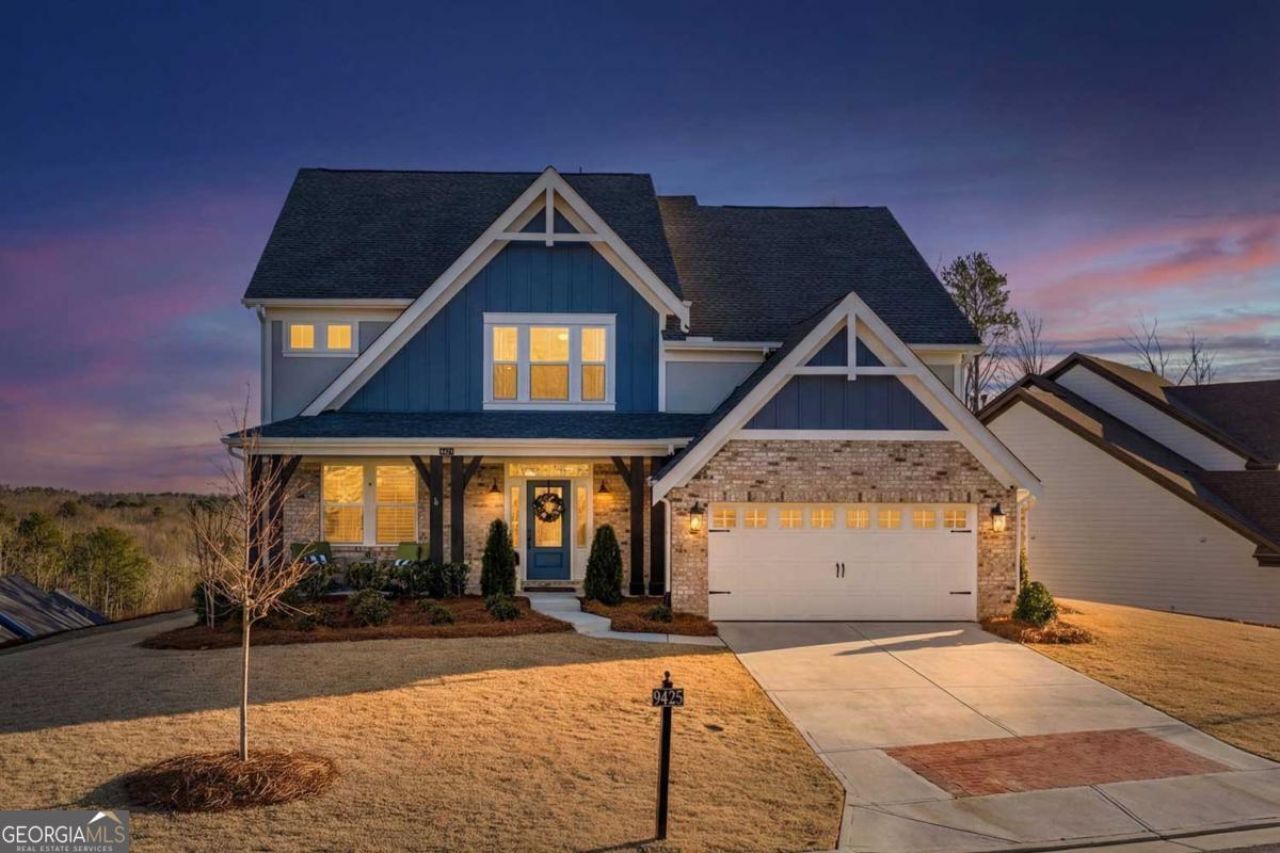Built in 2023 and located in desirable Forsyth County, this thoughtfully upgraded home sits near the highest point in the neighborhood and offers long-range views along with beautiful natural surroundings and access to resort-style community amenities - all at an exceptional value. The home features a north-facing front entry and a private lot with no homes directly behind. The main level offers an open, light-filled layout designed for everyday living and entertaining, with a welcoming foyer leading to a private home office with French doors and a seamless flow between the kitchen, dining area, and family room. The spacious two-story family room is a true focal point, featuring a wall of windows that fills the home with natural light and a dramatic floor-to-ceiling fireplace. The kitchen includes quartz countertops, white cabinetry, stainless appliances, a large island, and designer tile backsplash. Upstairs, the primary suite offers dual walk-in closets and a well-appointed bath with dual vanities and an oversized shower, while secondary bedrooms are generously sized and thoughtfully positioned. The finished lower level adds exceptional flexibility and is currently configured as a home office with a full wall of custom built-ins, ideal for remote work or multi-purpose living. Additional upgrades include Baldwin door hardware, an irrigation system, fenced backyard, and an expanded footprint with both the breakfast room and garage widened by 4 feet during construction. The laundry room includes a utility sink/dog wash station, and major appliances convey, including the washer, dryer, kitchen refrigerator, and family room TV. Outdoor living is equally appealing, with a covered rear porch overlooking peaceful surroundings and a fully fenced yard that has been professionally landscaped. Residents enjoy extensive community amenities including a clubhouse, tennis courts, playground, and a large pool complex with lap lanes and a separate wading pool. Tucked into a quieter pocket of Forsyth County yet convenient to the area's ongoing growth and amenities, this move-in-ready home delivers the rare combination of newer construction, meaningful upgrades, and strong long-term value.