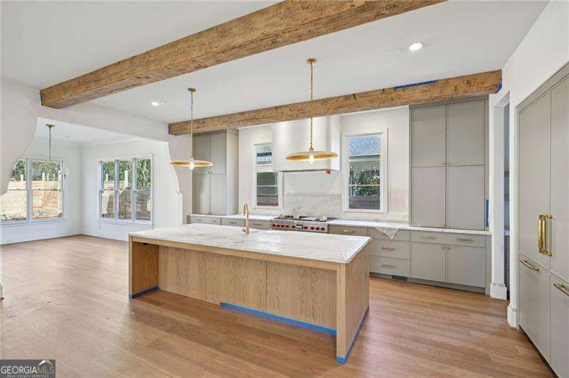 Welcome to 854 Courtenay Drive, an exceptional new construction opportunity located on one of Morningside's quietest and most picturesque streets. Thoughtfully designed and built by JackBilt, this home sits perfectly on a sunny, flat lot and offers 6 bedrooms, 6.5 bathrooms, and approximately 5,100 finished square feet across three levels. The stone tiled front porch is just a few steps above the quiet, wide, tree-lined street. A custom steel door leads you into the grand entry foyer with a stunning 2-story stair atrium. The designer kitchen has floor to ceiling custom cabinets, a 10' island with 5-seat breakfast bar, a Wolf 48 dual fuel range with griddle and convection, a Bosch dishwasher, and a 60 Thermador refrigerator/freezer. The bright scullery has ample pantry shelving plus a prep sink and a second Bosch dishwasher. The huge great room has a wet bar with beverage fridge and floating shelving, a reclaimed beamed ceiling, and an oversized wood-burning fireplace with gas starter and limestone surround. A triple slider door leads to a beautiful brick porch with another fireplace and a very rare flat, walk-out private, fenced, sunny backyard with room for a future pool. The enviable kitchen-level garage makes daily access easy via the custom-fitted mud room. A bonus away room on the main could be a bedroom suite, office, den, or play area. The upstairs stair landing offers brilliant views to below and of the neighborhood. The owner's suite has trey ceilings with reclaimed beams, a designer bath, and a huge walk-in custom closet with room for a sitting/dressing area. Generously sized secondary bedrooms all have en-suite baths and walk-in closets. The finished basement offers a large bedroom suite, ample storage, and a massive flexible living space with plenty of room for a gaming area plus a media space making this level ideal for family gatherings, entertaining, and hosting guests. All the interior finishes reflect JackBilt's high standards, and features include 10-foot ceilings on all levels, wide plank white oak flooring, solid 8-foot doors, and custom plumbing and lighting fixtures. The home is pre-wired for low voltage, CAT 6 and surround sound and includes a tankless water heater, upgraded HVAC systems , spray foam insulation at rooflines and overhangs, and a three-zone irrigation system. 854 Courtenay Drive is located in the heart of Morningside just a short walk to the shopping and entertainment district and offers easy access to Morningside Elementary, the Beltline, Morningside Nature Preserve, Midtown, and Piedmont Park. This home is a truly special opportunity to own a custom quality home in an unrivaled location.